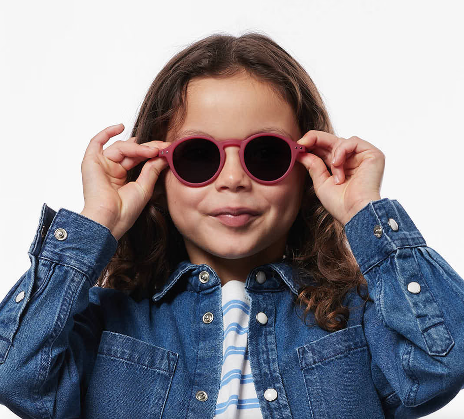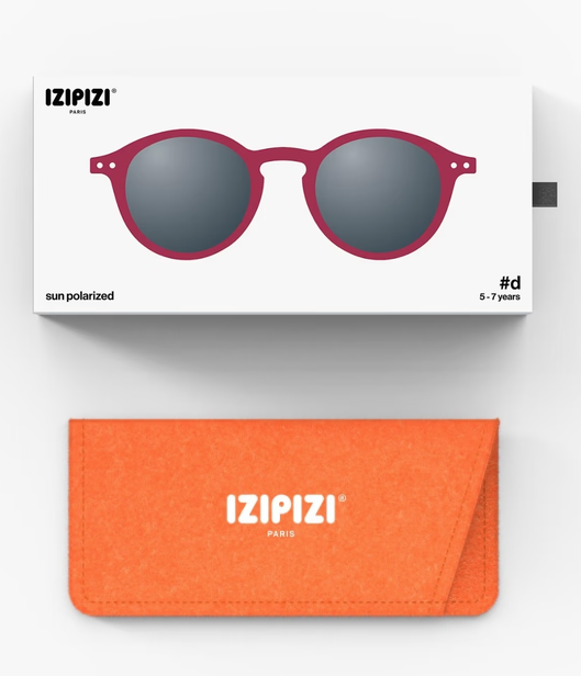 De #d Cranberry kinderzonnebril van Izipizi voor leeftijden 5 tot 7 jaar is een levendig, vrolijk exemplaar.