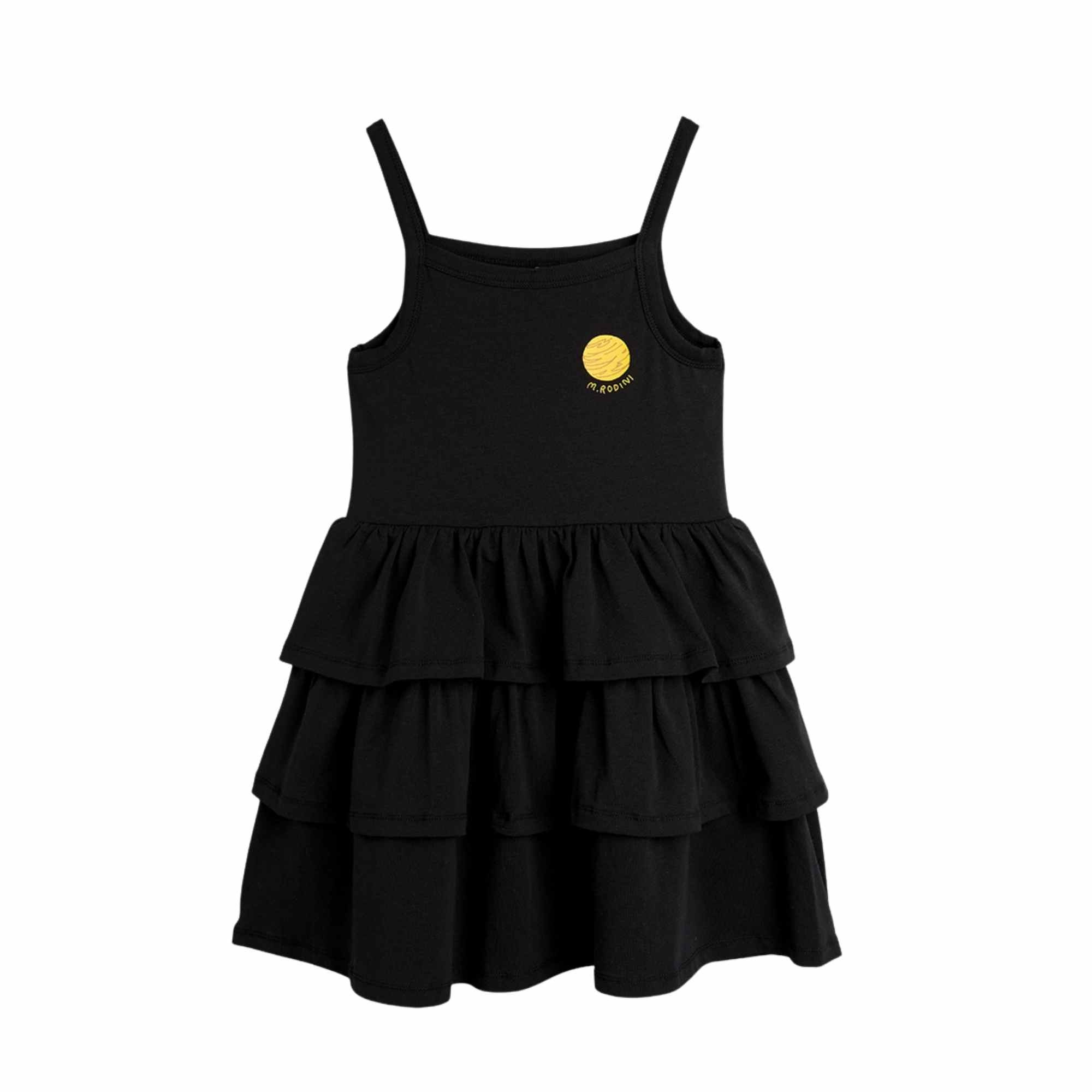 Laat haar stralen in deze Mini Rodini Planet SP tank dress – Black! Dit luchtige jurkje heeft smalle schouderbandjes en een vrolijk gelaagd rokgedeelte, wat zorgt voor een speels en vrij gevoel bij elke beweging.
